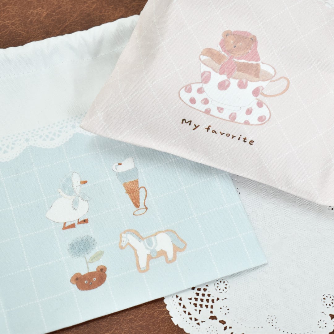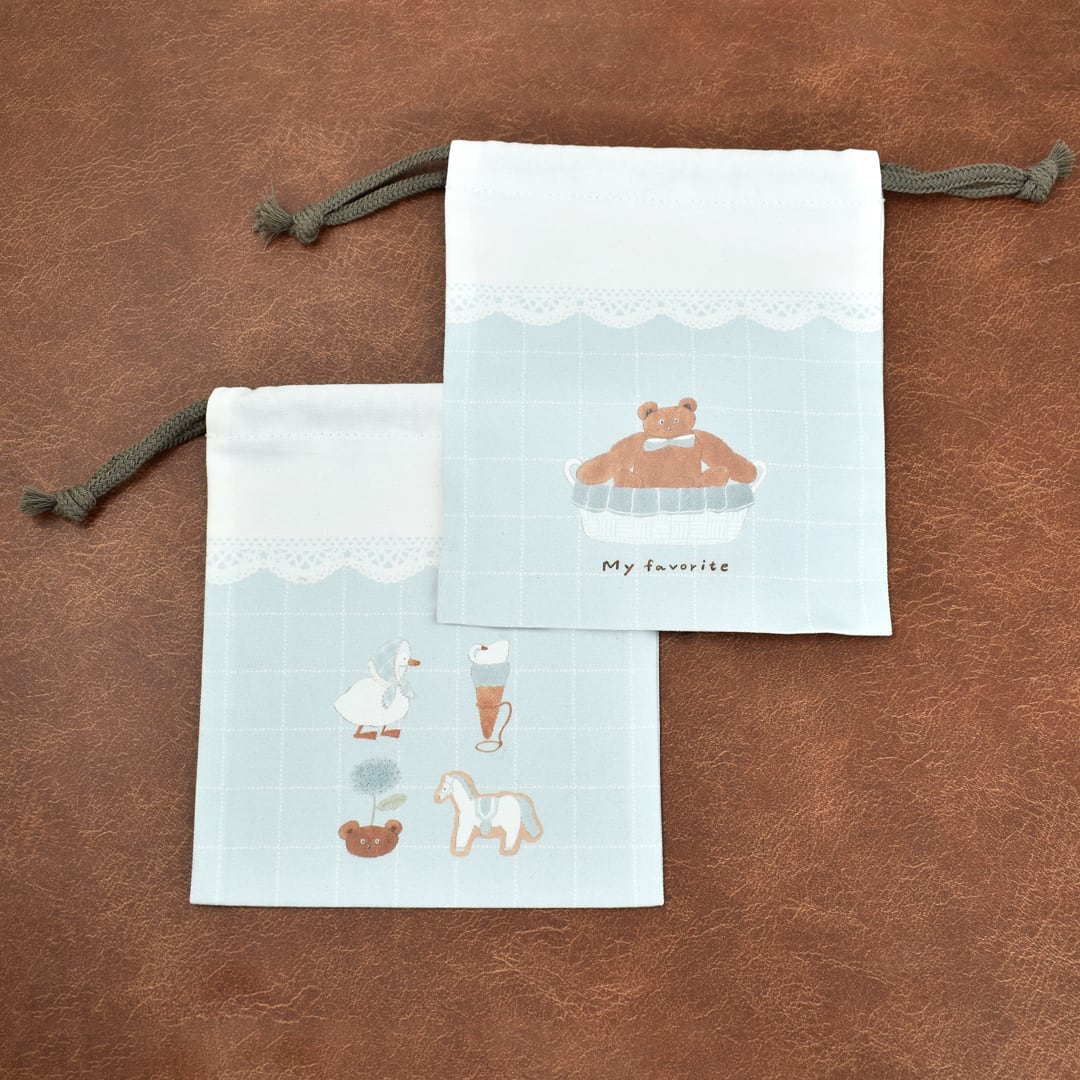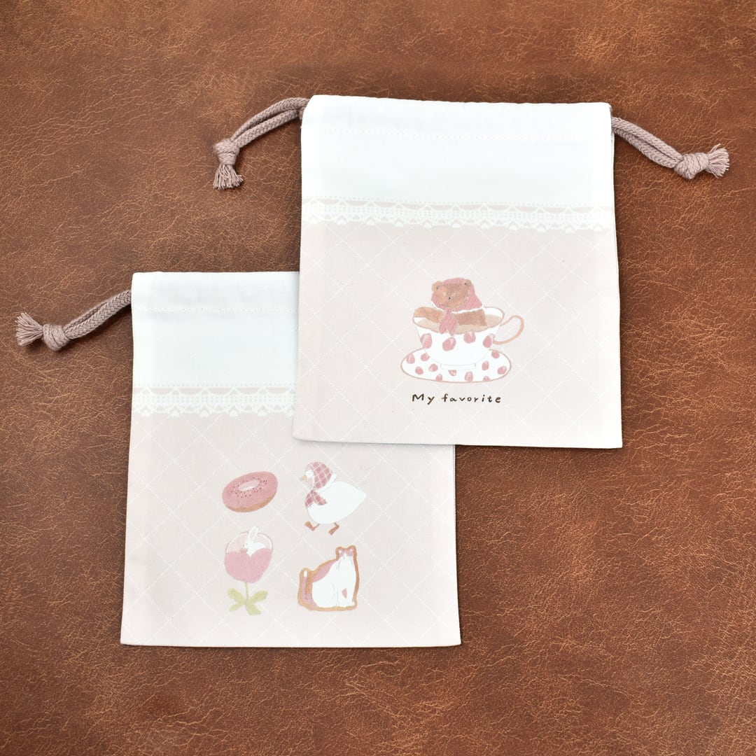 イラストレーターのトビマツショウイチロウさんデザインの巾着です。 小物入れやラッピングなど様々な用途でお使いいただけます。 サイズ(約):H180mm×W160mm 素材:綿100% MADE IN JAPAN