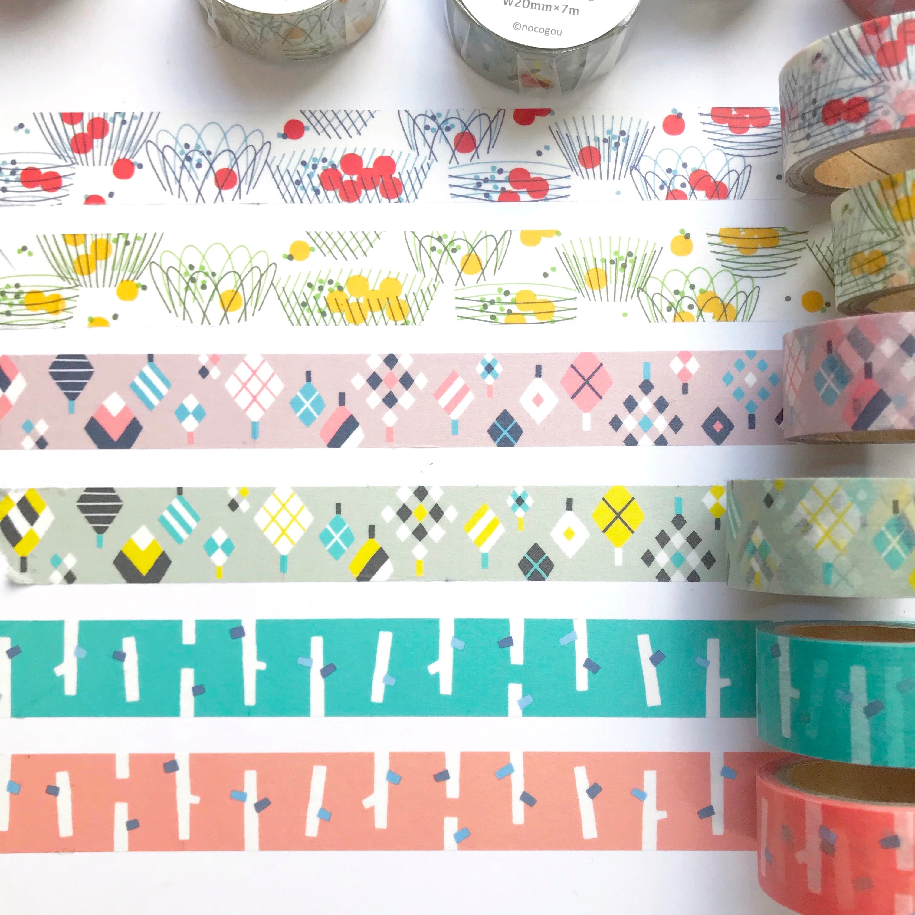 名古屋を中心にご夫婦で活動しているテキスタイルブランドnocogou(ノコゴウ)さんのデザインをマスキングテープにしました。 20mm×7m 丸天産業製 MADE IN JAPAN 重量:15g