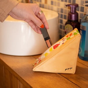 三角だから、使いにくそうと言われますが、マチがしっかり幅があるので、見た目以上に入り、自立するので、洗面台や、テーブル、ロッカー内で置きやすく便利です。バッグの中では角に収まるのでいい感じです。